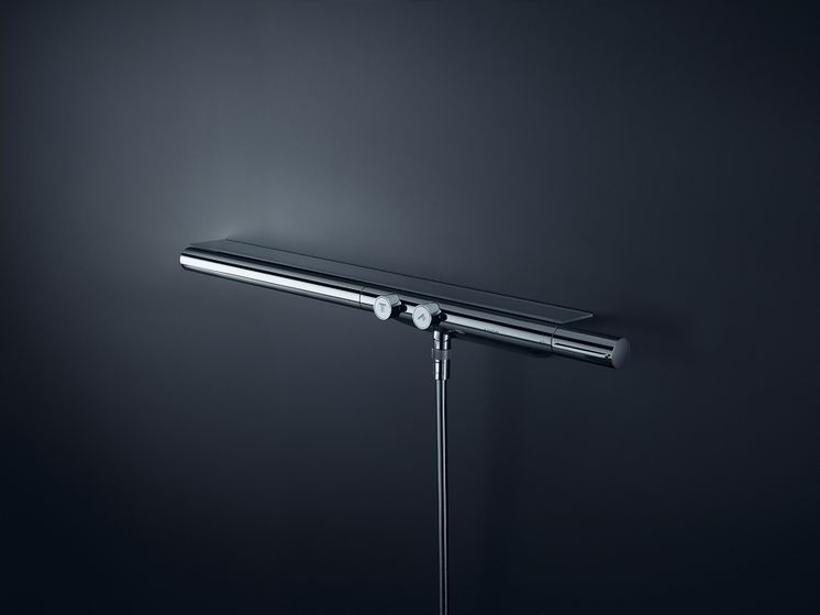 AXOR termostat 800. Åbn og luk for vandet med et tryk på de elegante knapper. Juster temperaturen med drejegrebet. Integreret glashylde.