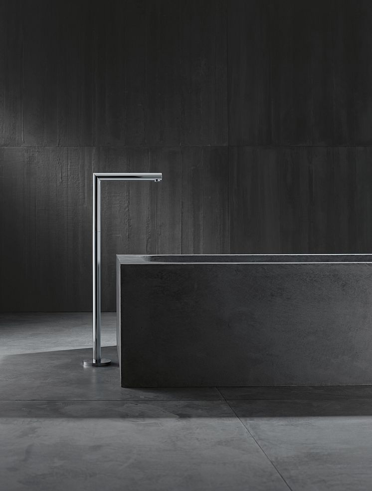 Den fritstående AXOR Uno kartud fås i buet eller som her i retvinklet design. Den minder om et rør, som stiger op fra gulvet.