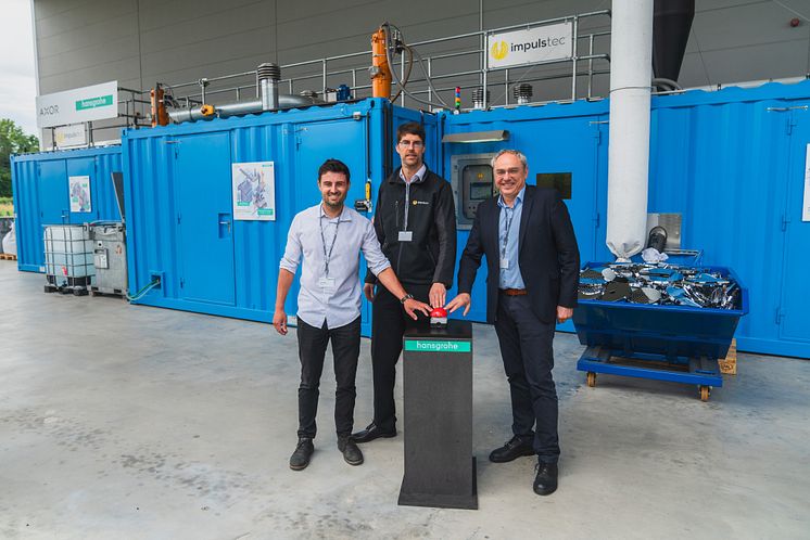 Hansgrohe Group har taget et skræddersyet genanvendelsesanlæg til galvaniseret plast i brug på deres fabrik i sydtyske Offenburg. Fra venstre: David Zapf, specialist i overfladeteknologi i Hansgrohe SE, Stefan Eisert, direktør i ImpulsTec GmbH og Frank Semling, næstformand i bestyrelsen og COO i Hansgrohe SE.