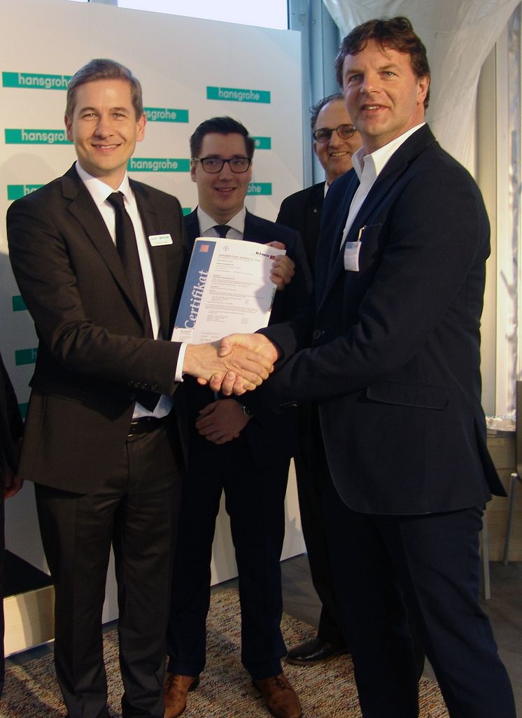 Thomas Leth, General Manager Nordics og administrerende direktør, Hansgrohe Danmark, modtager den svenske typegodkendelse for en række AXOR og hansgrohe produkter af Ronald Karel, divisionschef hos Kiwa.