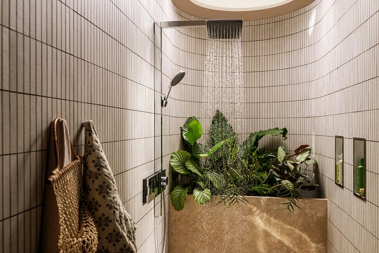 Raindance Alive Showerpipen er monteret så fladt ind til væggen, at den ser indbygget ud - men det er den ikke.
