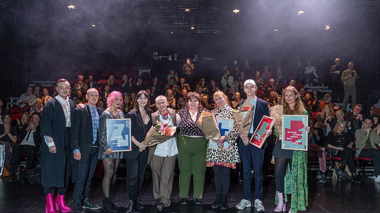 Fra venstre: Modtager af Spireprisen 2023, UKØN X Lesbisk Fredag, modtager af Hovedprisen 2023, Liv Thomsen, modtager af Talentprisen 2023, Malte Houe og modtager af Særprisen 2023, Kunstnerkolonien på DR2.