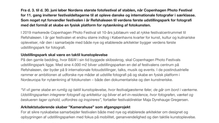 I 2019 markerede Copenhagen Photo Festival sit 10-års jubilæum ved at rykke festivalcentrummet til Refshaleøen. I år gør festivalen et endnu større indtog i Københavns kvarter for kunst, kultur og kulinariske oplevelser, når den i samarbejde med både nye og etablerede arkitekter bygger verdens første udstillingspark for fotografi.