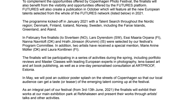 For mere om de fem Future Nordic Talents fotografer, se vedhæftede.