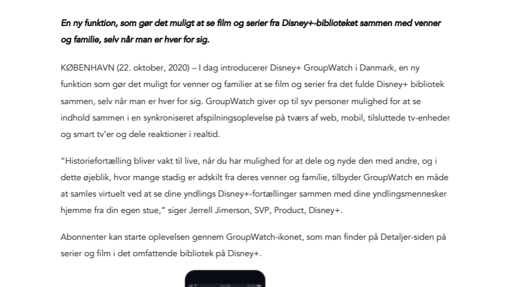 ”Historiefortælling bliver vakt til live, når du har mulighed for at dele og nyde den med andre, og i dette øjeblik, hvor mange stadig er adskilt fra deres venner og familie, tilbyder GroupWatch en måde at samles virtuelt ved at se dine yndlings Disney+-fortællinger sammen med dine yndlingsmennesker hjemme fra din egen stue,” siger Jerrell Jimerson, SVP, Product, Disney+.