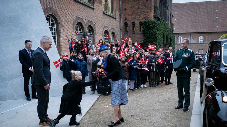 I dag besøgte Hendes Majestæt Dronningen Dansk Jødisk Museum som led i den officielle markering af 400 året for jødisk liv i Danmark. Ved ankomsten blev Majestæten præsenteret for Daniel Libeskinds nye ikoniske indgangsparti efterfulgt af en rundvisning i museets helt nye udstillinger.