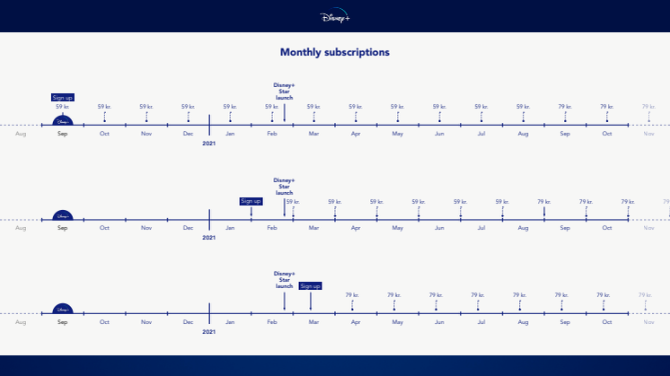 Danske kunder kan p.t. abonnere på Disney+ for 59 kroner om måneden eller 589 kroner årligt (den årlige pris er tilgængelig hos de fleste forhandlere). De fulde detaljer om, hvordan man abonnerer, kan findes på Disneyplus.com. Fra den 23. februar koster Disney+ 79 kroner eller 790 kroner årligt. De nuværende priser for eksisterende abonnenter (før 23. februar) bliver fastholdt i seks måneder, hvorefter prisændringen vil træde i kraft fra den første månedlige eller årlige fornyelsesdato efter den 22. august 2021.
