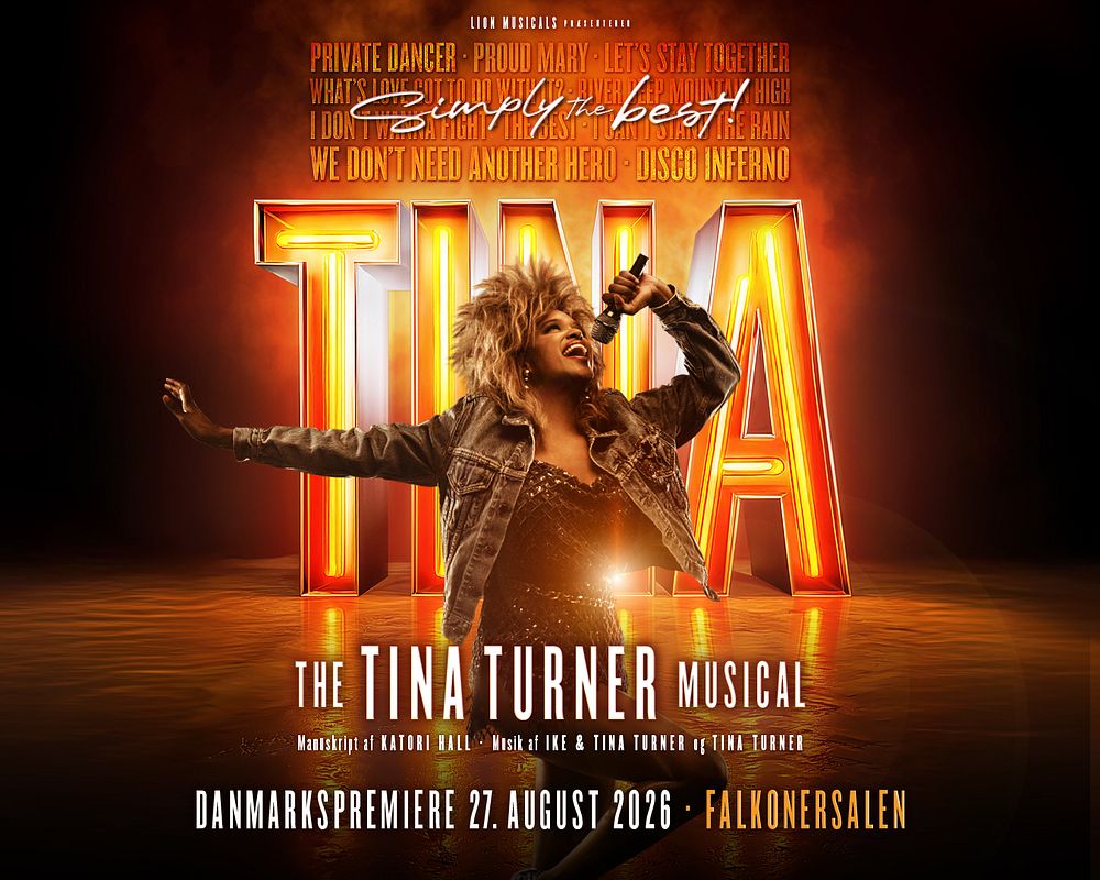SIMPLY THE BEST! For første gang nogensinde kan et dansk publikum opleve den internationalt anmelderroste musical om rockikonet Tina Turner. TINA – THE TINA TURNER MUSICAL får premiere den 27. august 2026 i Falkonersalen i København med den danske stjerne Iris Gold i hovedrollen. Herefter drager forestillingen på landsdækkende turné til Aarhus, Vejle, Odense, Aalborg, Esbjerg, Sønderborg, Randers og Holstebro.