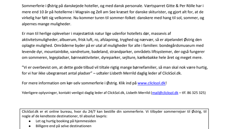 ClickSol.dk er et online bureau, hvor du 24/7 kan bestille din sommerferie. Vi tilbyder sommerrejser til Østrig, til nogle af de kendteste destinationer, til absolut lavpris: