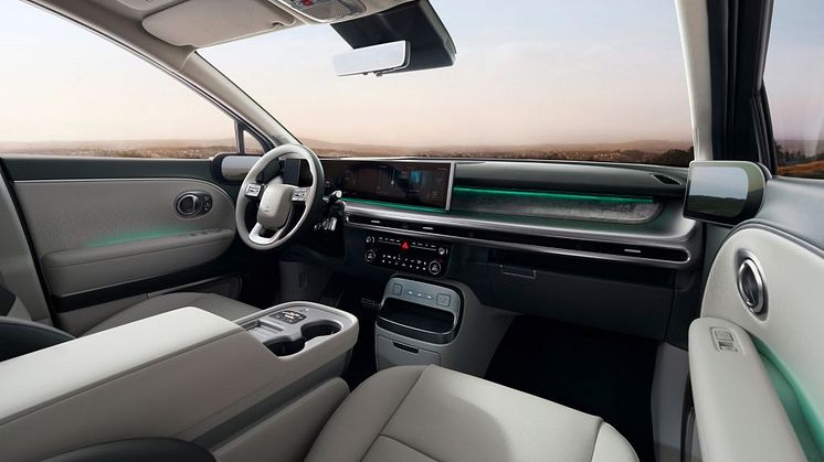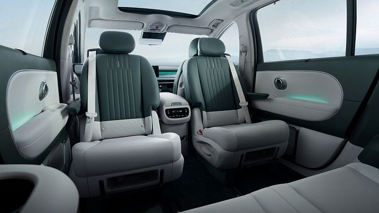Kabinen i IONIQ 9 er designet som en mobil lounge med bløde, elliptiske former og afdæmpede farver, der skaber en afslappede og indbydende atmosfære.