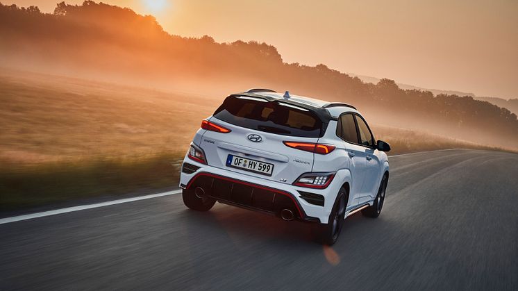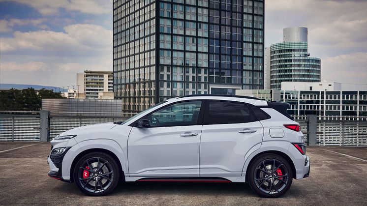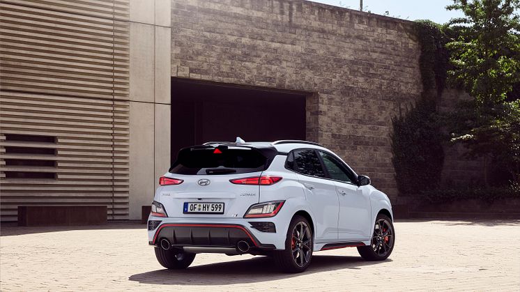 Den nye KONA N har fået flere sportsdetaljer, hvilket blandt andet er tydeliggjort ved den sænkede undervogn og de røde detaljer ved sideskørterne. Luftindtaget på bilen dominerer fronten og sørger for, at motoren får den nødvendige nedkøling, når den præsterer sit yderste. Og med de store udstødningsrør følger ekstra høj brummen.