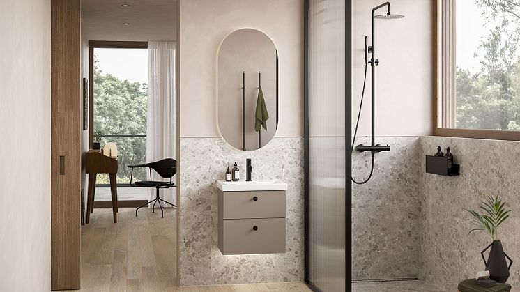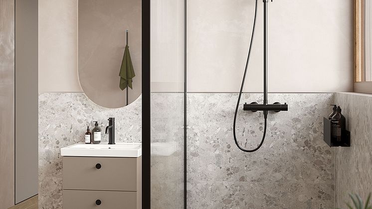 Kom med os ind på badeværelset, hvor vi bliver mødt af et anderledes bruseglas, nordafrikansk tadelakt og udsøgt Terrazzo, alt stilfuldt indrammet med sorte detaljer på bruser, brusesystem og håndklædetørrer.