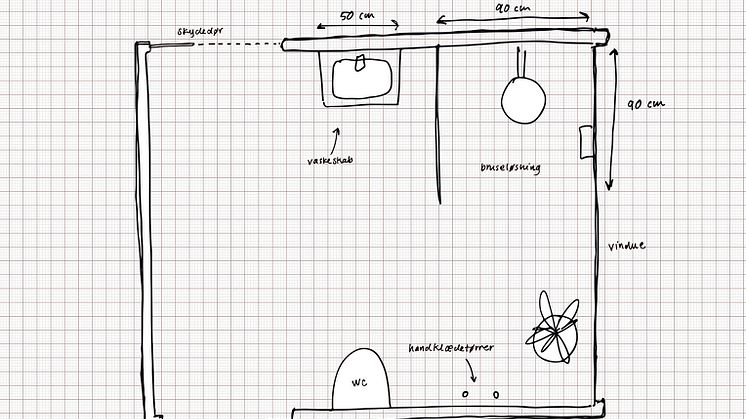 Badeværelset bød på nogle planlægningsmæssige udfordringer. Med vandrette vinduer langs hele ydervæggen og to døråbninger skulle Sanna virkelig tænke sig om. På den ene af de to tilbageværende vægge skulle hun både have en bruseløsning og et møbel. På den anden, et toilet og håndklædetørrer. Vinduespartiet tvang hende til at skippe de oprindelige planer om et brusehjørne. Det tog et par dage med intensiv skitsering, før hun endelig fandt løsningen med en fast brusevæg som skillevæg mellem rummet og bruseområdet.