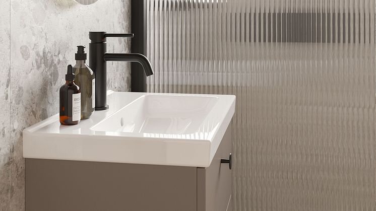 På et lille badeværelse er det almindeligt, at man ønsker at få, så meget ind som muligt – da størrelsen begrænser. Resultatet kan nemt blive et overfyldt badeværelse hvor man føler sig indespærret. Sanna mente det modsatte. For hende var det vigtigere at skabe et attraktivt og personligt badeværelse end at have plads til det hele. Så i stedet for et traditionelt spejlskab over kommoden, faldt valget på et ovalt spejl med belysning bag kanten, som hun vidste ville gøre meget for stemningen i rummet. Hertil et mindre men rummeligt møbel i jordfarven, Earth NCS S 5005-Y20R. Møblet har sensorstyret belysning indeni og under som tilvalg.