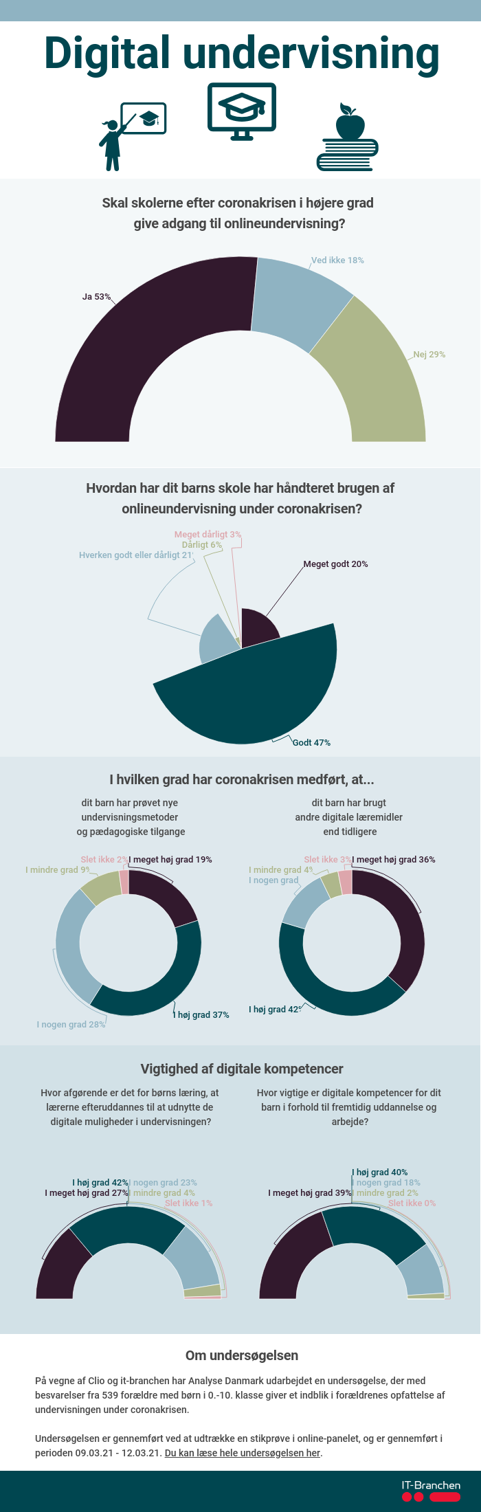 På vegne af Clio og it-branchen har Analyse Danmark udarbejdet en undersøgelse, der med besvarelser fra 539 forældre med børn i 0.-10. klasse giver et indblik i forældrenes opfattelse af undervisningen under coronakrisen.