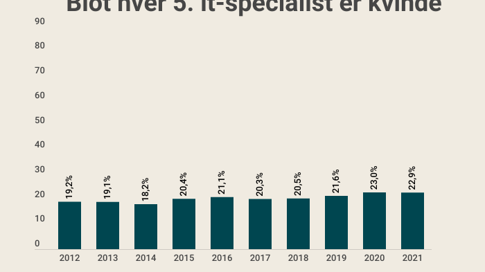 Det ser ikke godt ud for diversiteten i it-branchen. Over de seneste år, har andelen af kvindelige it-specialister stor set ikke rykket sig. Det viser de nyeste tal fra Eurostat. På blot 10 år er andelen af kvinder kun vokset fra 19,2% til 22,9%.