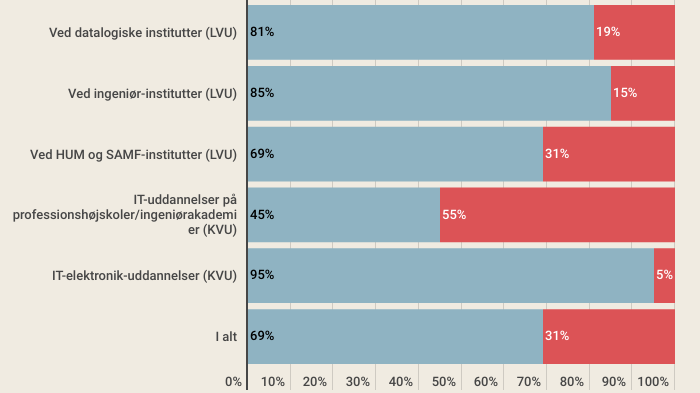 Ser man på kønsfordelingen på it-uddannelserne og dermed på, hvem der i løbet af de næste år bliver uddannet indenfor it, ser det ikke meget bedre ud.
