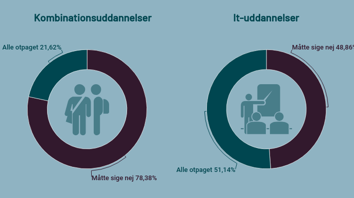 På 48,9% af de rene it-uddannelser kom der flere ansøgere, end der var studiepladser, og man måtte derfor sige nej til ellers kvalificerede ansøgere. På de såkaldte kombinationsuddannelser, hvor man blander it med f.eks. humaniora eller samfundsvidenskab, måtte man på hele 78,4% af uddannelserne sige nej til ansøgere pga. pladsmangel.