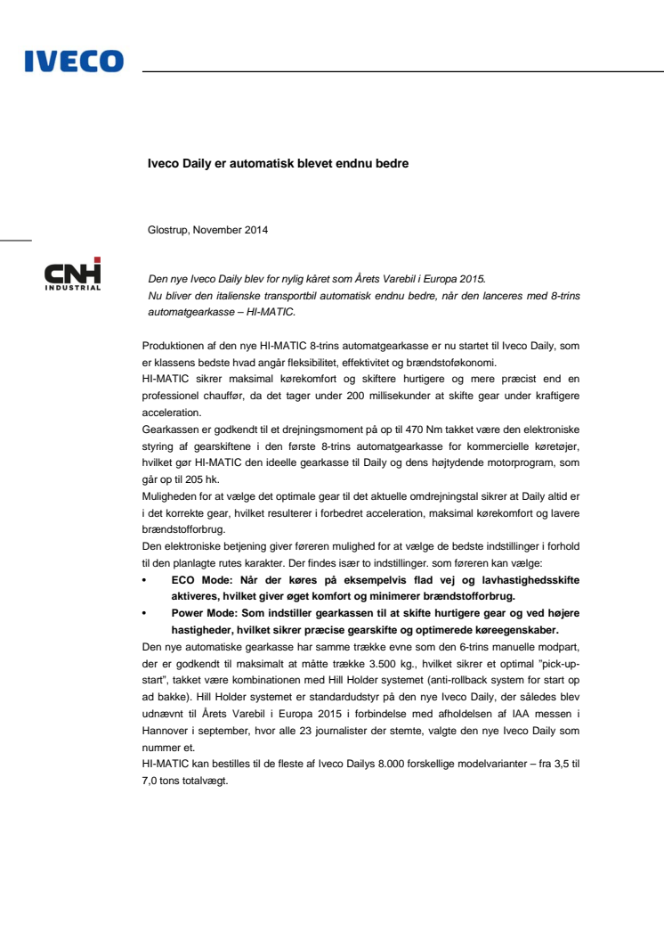 Nu bliver den italienske transportbil automatisk endnu bedre, når den lanceres med 8-trins automatgearkasse – HI-MATIC.