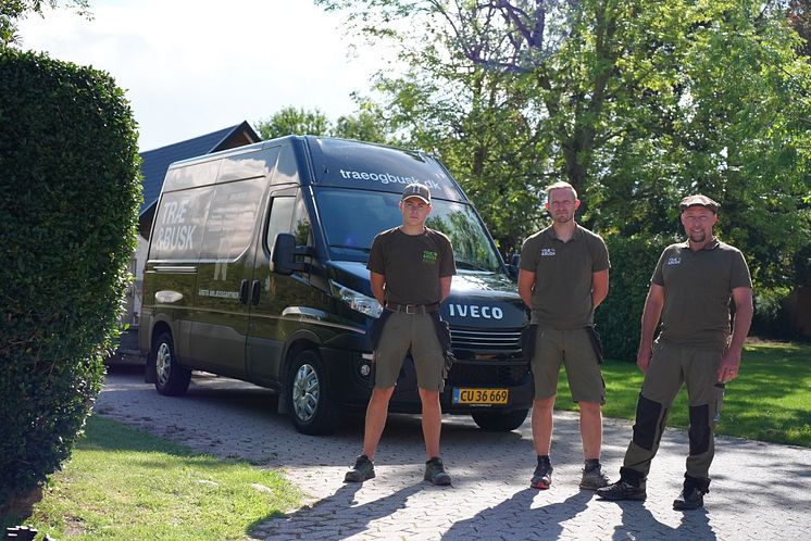Morten Ingemann og to af de ansatte i anlægsfirmaet TRÆ & BUSK foran deres IVECO Daily.