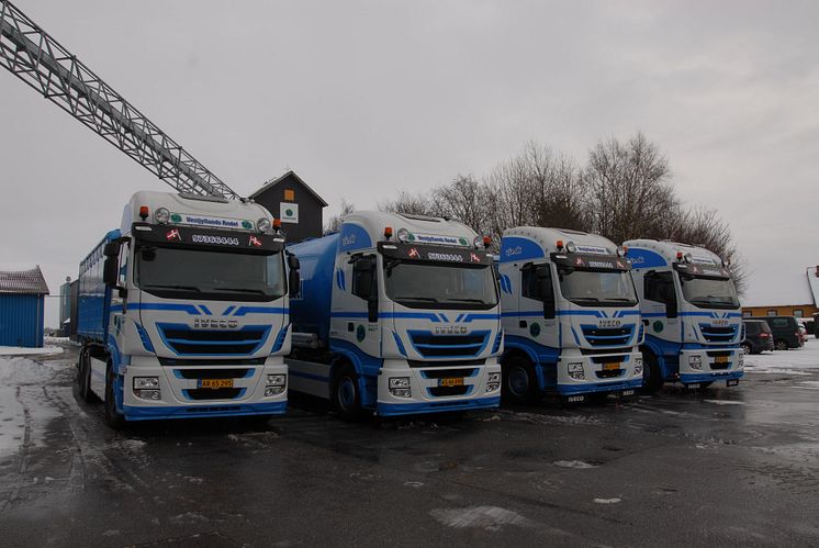 Fire på stribe - fire Iveco Stralis linet op på pladsen hos Vestjyllands Andel i Boris sydvest for Herning. Der er tale om treakslede forvogne med tilhørende påhængsvogne eller kærre. De to ladopbygningerne er helt nye på både forvogn og anhænger, mens der er tale om overflytning af eksisterende opbygninger for tankvognenes vedkommende.