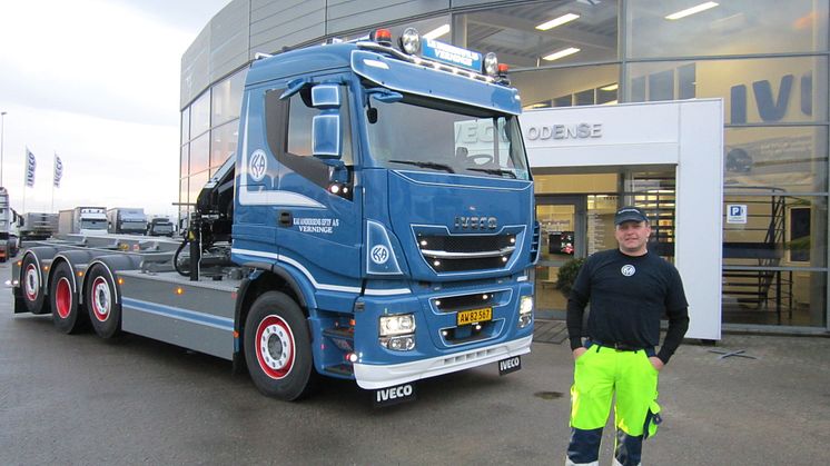 Vognmandsfirmaet Kai Andersens Eftf. A/S i Tommerup på Fyn har fået leveret en ny fire-akslet IVECO Stralis med tripplebogie. Den fynske vognmandsvirksomhed kunne med den nye IVECO, som er virksomhedens første, glæde chauffør Per Kim Pedersen.