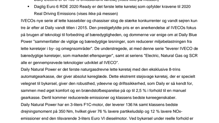 Det grønne fokus bifaldes af IVECO, der som verdens førende leverandør af gasdrevne køretøjer både udstiller på sin egen stand og i det særlige grønne område. Her kan de besøgende f.eks. kigge forbi og opleve Årets Varebil 2018, IVECO Daily Blue Power, samt den helt nykårede ”Sustainable Truck of the Year 2019” IVECO Stralis NP 460 hk.