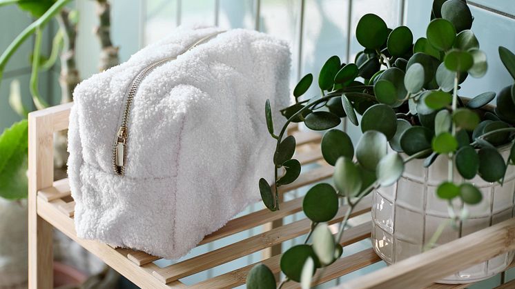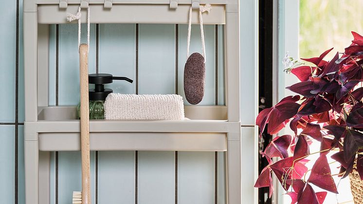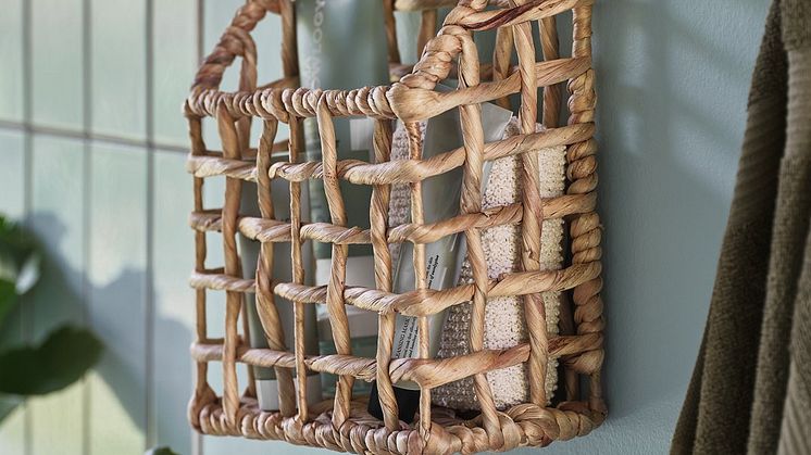 KAREBY badeværelsesopbevaring, der fås i beige og grøn, er en elegant måde at organisere dine nødvendigheder på, samtidig med at det tilføjer et naturligt præg til rummet. Kombinér det med HAGUDA-kurven, som kan hænges på væggen for at opbevare småting og samtidig fungere som et dekorativt element.