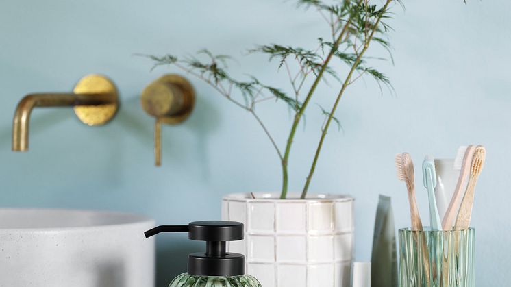 Giv din badeværelsesindretning et løft med de friske grønne toner fra KATTARP-kollektionen. Denne elegante serie, fremstillet af genbrugsglas, omfatter en sæbedispenser, tandbørsteholder og bakke, som forener funktionalitet med stil.