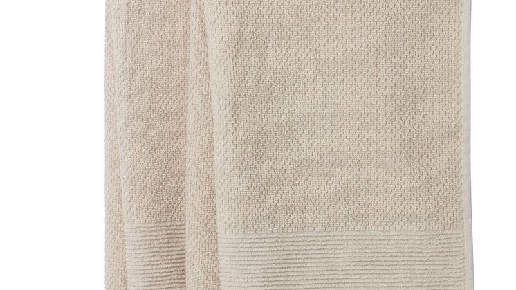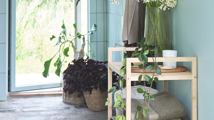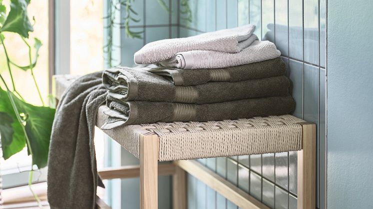 For et gennemført naturligt tema kan du fuldende indretningen med GISTAD badehåndklæder, der fås i beige, grøn og asfalt. Arranger dem på ESKELUND-bænken for at skabe en visuel kontrast af materialer og farver.