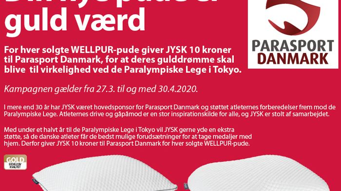For hver solgte WELLPUR-pude giver JYSK 10 kroner til Parasport Danmark for at give para-atleterne de bedste forudsætninger om at nå deres mål til Para-OL i Tokyo.