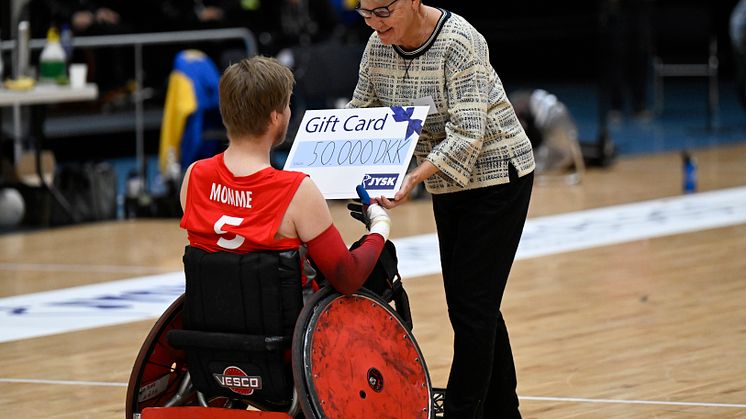 Kaare Momme Nielsen, landsholdsspiller i kørestolsrugby, blev mandag aften første modtager af JYSKs ”Bring Dedication”-legat, da Danmark slog Brasilien i åbningskampen ved VM i Vejle.