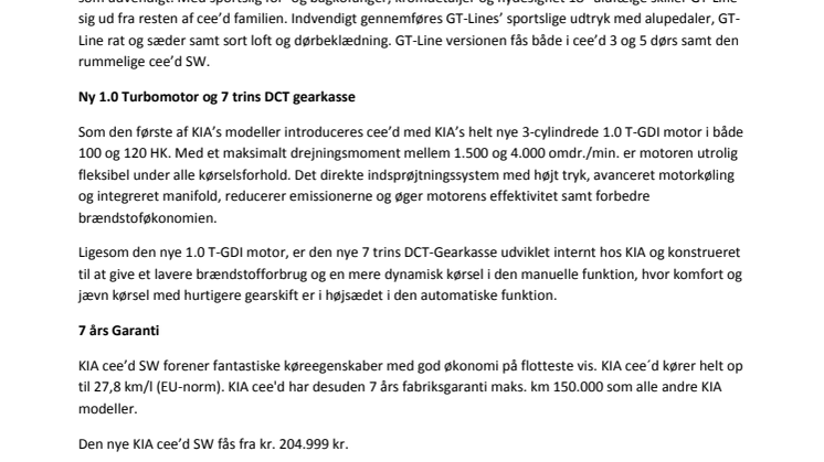 Som den første af KIA’s modeller introduceres cee’d med KIA’s helt nye 3-cylindrede 1.0 T-GDI motor i både 100 og 120 HK. Med et maksimalt drejningsmoment mellem 1.500 og 4.000 omdr./min. er motoren utrolig fleksibel under alle kørselsforhold. Det direkte indsprøjtningssystem med højt tryk, avanceret motorkøling og integreret manifold, reducerer emissionerne og øger motorens effektivitet samt forbedre brændstoføkonomien.