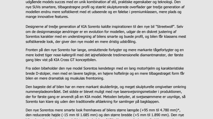 Designerne af tredje generation af KIA Sorento kaldte inspirationen til den nye bil "Streetwolf". Selv om de designmæssige ændringer er en evolution for modellen, udgør de en diskret justering af Sorentos karakter med en understregning af bilens smarte og buede profil, og bilen får klassens mest sofistikerede look, der giver den nye model en mere dristig udstråling.