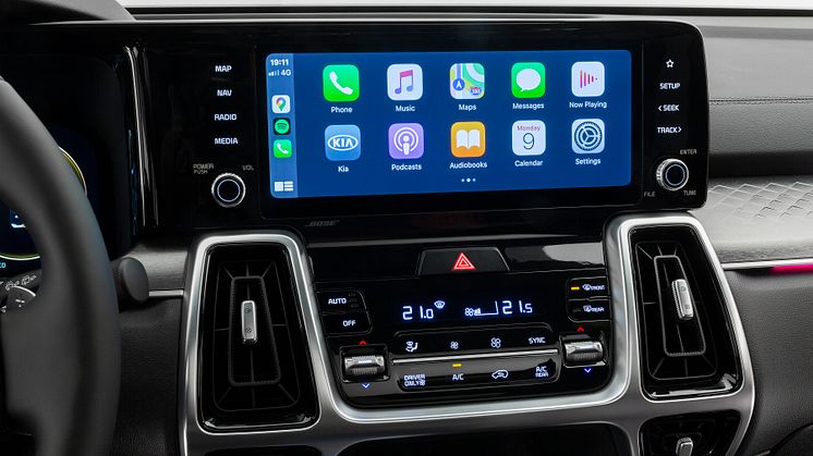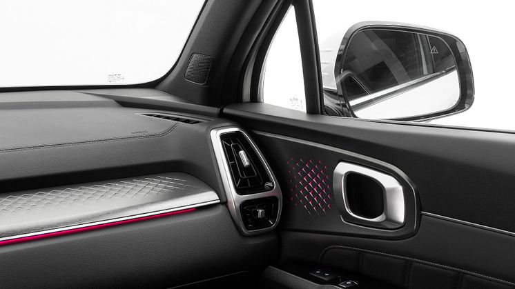 Et kraftfuldt BOSE®-surroundsound-audiosystem med 12 højttalere fås også, og det giver en mere fordybende lyd til alle tre sæderækker. En ny "Sound of Nature"-ambientelydfunktion, som er tilgængelig på nogle markeder, gør det muligt for personerne i bilen at lytte til forskellige afslappende lyde fra naturen. Med kabinens Mood Lighting-system kan brugeren skræddersy kabinen i endnu højere grad ved at lade kabinen oplyse i en af syv forvalgte farver, der er specielt udvalgt til KIAs indvendige design, eller i en af de øvrige i alt 64 forskellige farver.