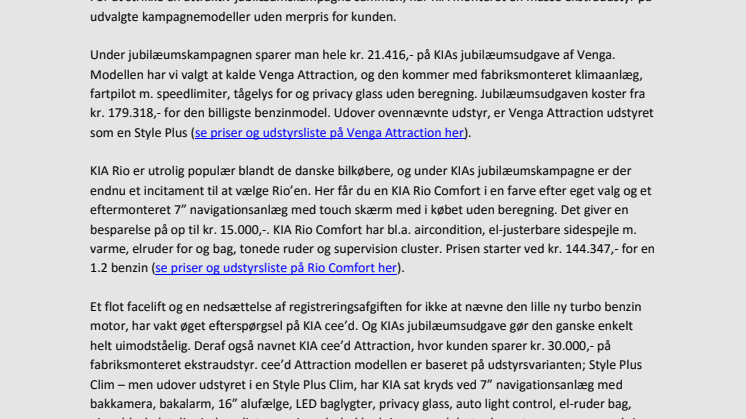 For at strikke en attraktiv jubilæumskampagne sammen, har KIA monteret en masse ekstraudstyr på udvalgte kampagnemodeller uden merpris for kunden.
