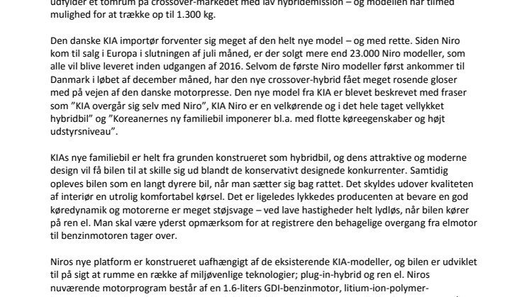 Den danske KIA importør forventer sig meget af den helt nye model – og med rette. Siden Niro kom til salg i Europa i slutningen af juli måned, er der solgt mere end 23.000 Niro modeller, som alle vil blive leveret inden udgangen af 2016. Selvom de første Niro modeller først ankommer til Danmark i løbet af december måned, har den nye crossover-hybrid fået meget rosende gloser med på vejen af den danske motorpresse. Den nye model fra KIA er blevet beskrevet med fraser som ”KIA overgår sig selv med Niro”, KIA Niro er en velkørende og i det hele taget vellykket hybridbil” og ”Koreanernes ny familiebil imponerer bl.a. med flotte køreegenskaber og højt udstyrsniveau”.