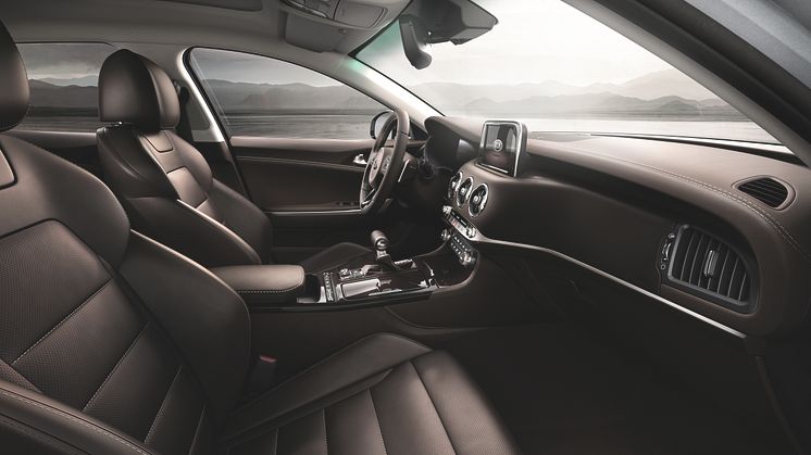 Opkoblingsmuligheder, entertainment og bilinformationer kan være lige så vigtige som en dynamisk køreoplevelse, og Stinger kommer på markedet med de nyeste infotainmentsystemer. Det højdejusterbare head up-farvedisplay (HUD)[v] gør det muligt for føreren at se vigtige køreinformationer reflekteret på forruden. Informationerne omfatter hastighed, navigationsanvisninger, indstillinger for audiosystem og fartpilot og informationer fra Blind Spot Detection. I midterkonsollen er der en trådløs oplader til smartphones, og Bluetooth®[vi] håndfri betjening er standardudstyr, mens mange af bilens undersystemer kan betjenes via betjeningselementerne på rattet.