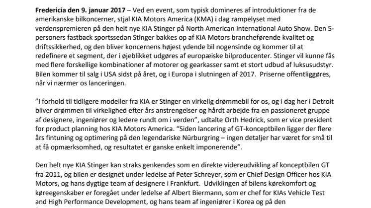 ”I forhold til tidligere modeller fra KIA er Stinger en virkelig drømmebil for os, og i dag her i Detroit bliver drømmen til virkelighed efter års anstrengelser og hårdt arbejde fra en passioneret gruppe af designere, ingeniører og ledere rundt om i verden”, udtalte Orth Hedrick, som er vice president for product planning hos KIA Motors America. “Siden lancering af GT-konceptbilen ligger der flere års fintuning og optimering på den legendariske Nürburgring – ingen detaljer har været for små til at få opmærksomhed, og resultatet er ganske enkelt imponerende”.