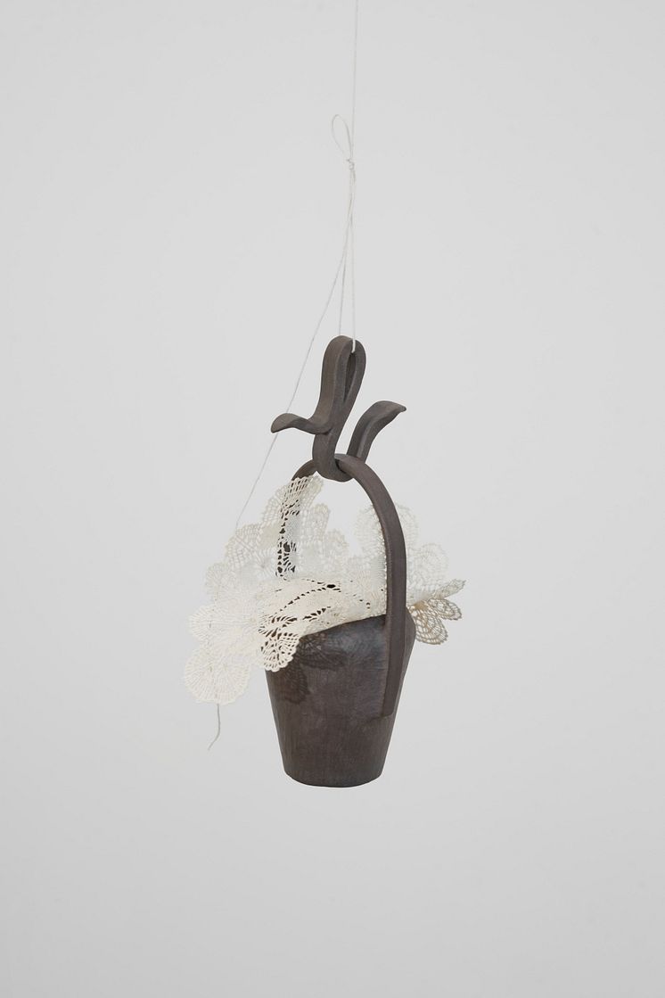 Installationsview fra Forårsudstillingen 2024 på Kunsthal Charlottenborg: Sidsel Lindbæk Mouridsen, Barselskrukke/urne, 2023.