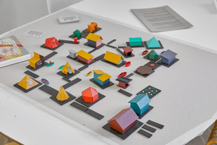 Installationsview fra Forårsudstillingen 2024 på Kunsthal Charlottenborg: Henrik Valeur, Spillet om det Flydende Bofællesskab, 2023.
