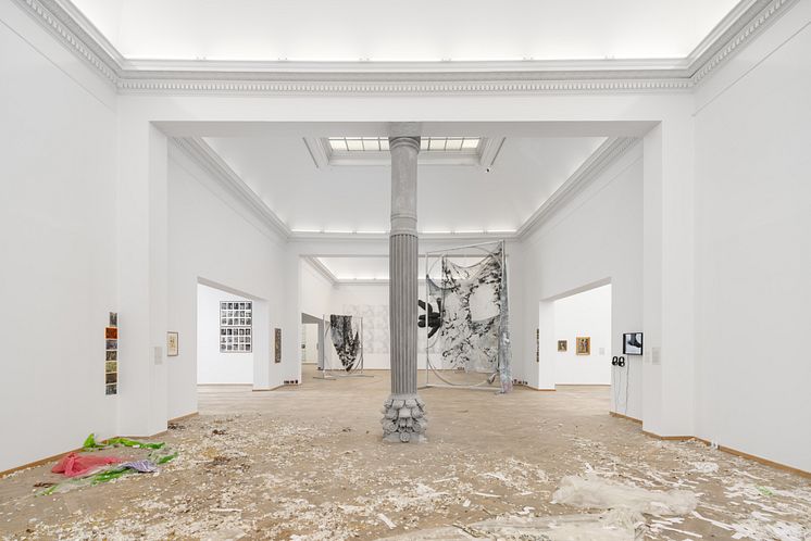 Maryam Jafri, Untitled (Obstruction), 2023. Jason Dodge, 2023. Isabel Lewis in romance with Dirk Bell, In Repair, 2023. Henrik Plenge Jakobsen, Efterbilleder (Afterimages), 2023. Gunnar Aagaard Andersen, Tegn, 1971. Installation view, Full of Days, Kunsthal Charlottenborg, 2023. Photo by David Stjernholm.