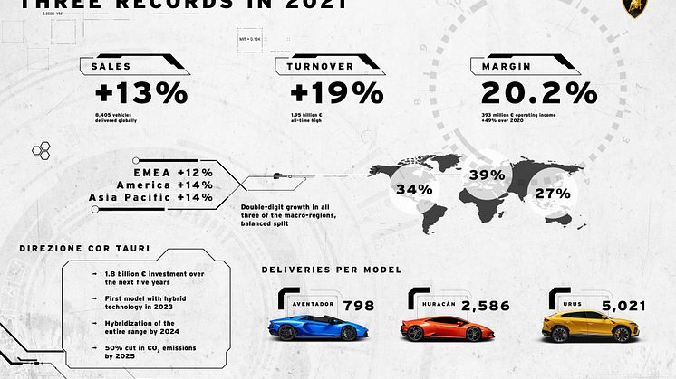 2021 var også det bedste år nogensinde på et forretningsmæssigt niveau med 8.405 udleverede biler på verdensplan (+13 % sammenlignet med 2020). Overordnet set voksede de tre makroregioner, hvor Lamborghini er til stede, med tocifrede tal: Amerika (+14 %), Asien/Stillehavslandene (+14 %) og EMEA (Europa, Mellemøsten og Afrika, +12 %), hvor henholdsvis 34 %, 27 % og 39 % af det globale salg er fordelt ligeligt.
