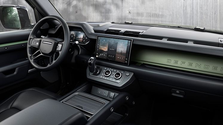Defenders slidstærke og alsidige interiør har fået en lignende optimering med tværbjælken, der er lakeret i børstet Grasmere Green Powder Coat, og laserætsede detaljer på tværbjælkens endestykker. Sæderne er udført i Resist Ebony med hockeystaven på midterkonsollen i Robustec-materiale – det mest robuste stof, der fås til Defender.