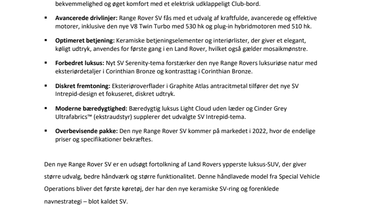 - Ny Range Rover SV: En unik fortolkning af Range Rovers luksus og personlighed, der er håndlavet af Special Vehicle Operations, bliver også præsenteret og kommer på markedet senere i 2022.