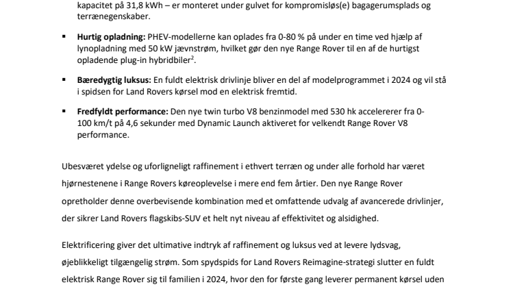 - Helt elektrisk: Den fuldt elektriske Range Rover bliver en del af sortimentet i 2024, hvilket for første gang vil medføre nul udledning.