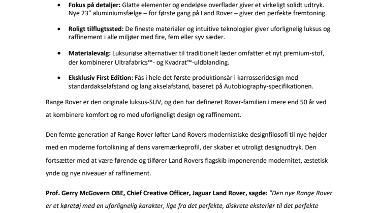Thierry Bolloré, Chief Executive Officer, Jaguar Land Rover, sagde: "Den nye Range Rover er et fremragende udtryk for vores vision om at skabe verdens mest eftertragtede luksusbiler til de mest kræsne kunder. Den skriver det næste kapitel i den unikke historie om banebrydende innovation, der har været et af Range Rovers kendetegn i mere end 50 år."