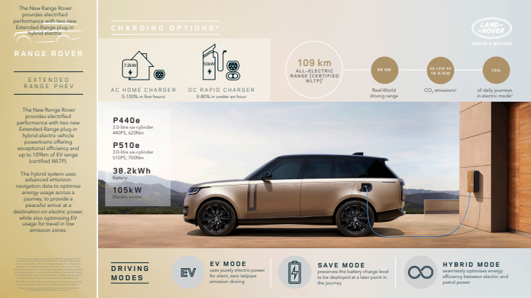 Nick Collins, Executive Director Vehicle Programmes, Jaguar Land Rover, sagde: "Den nye Range Rover er den mest eftertragtede, elegante og alsidige luksus-SUV i verden. Vores nye effektive Extended-Range Plug-in Hybrid Electric Vehicle-drivlinjer løfter Driving Experience med en fin balance mellem ydelse, raffinement og effektivitet, så ejerne kan gennemføre nærmest lydløse køreture med nul udledning på op til 109 kilometer."
