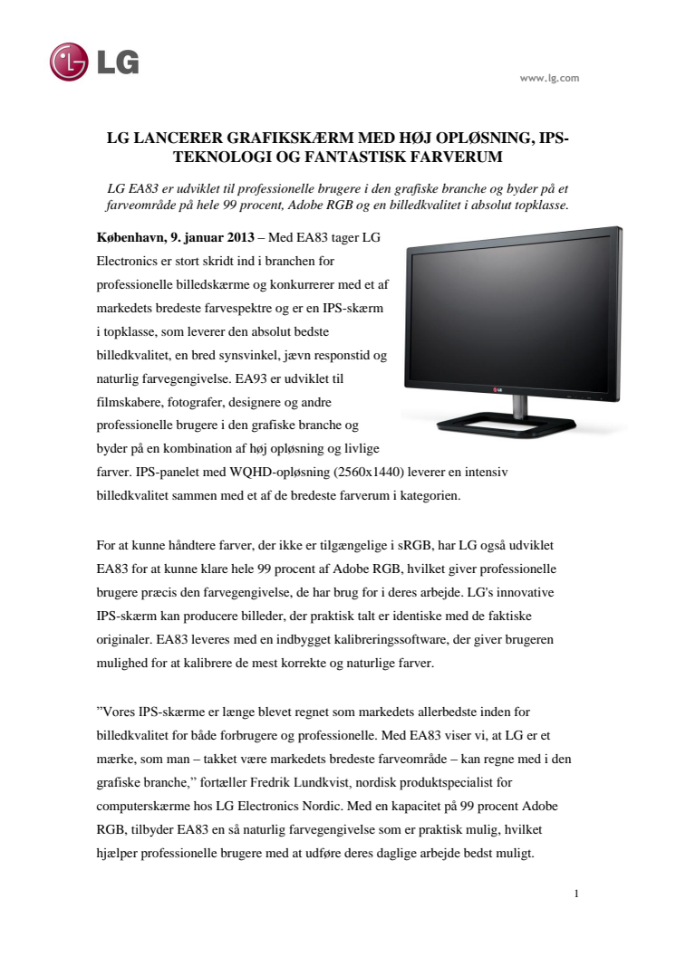 LG LANCERER GRAFIKSKÆRM MED HØJ OPLØSNING, IPS-TEKNOLOGI OG FANTASTISK FARVERUM