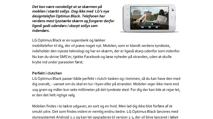 Det kan være vanskeligt at se skærmen på mobilen i stærkt sollys. Dog ikke med LG’s nye designtelefon Optimus Black. Telefonen har verdens mest lysstærke skærm og fungerer derfor ligeså godt udendørs i skarpt sollys som indendørs.